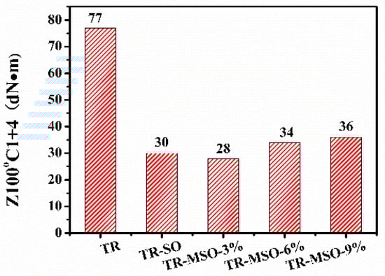 The curing characteristics of the tire tread rubber plasticized with different quantities of MSO-6 is shown in Figure 6. With increasing contents of MSO-6S, both the maximum and minimum torques of the rubber are significantly reduced, which indicates that MSO-6S has very good plasticization effect. The decrease of minimum torque is in accord with the Mooney viscosity result.