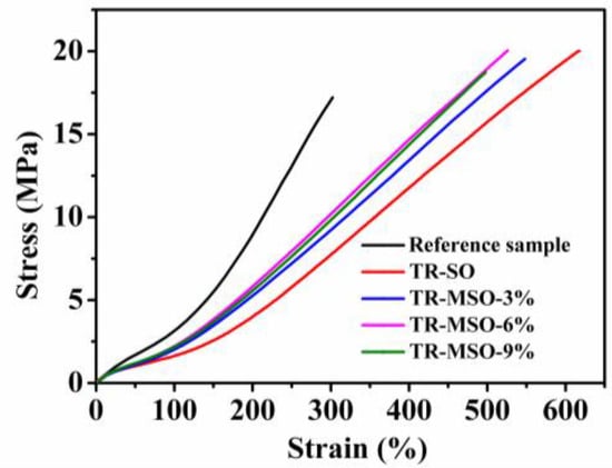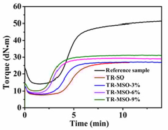 An optimal crosslink density is very important to achieve rubber with good mechanical properties. The addition of plasticizers will generally lead to a decrease in the crosslinking density of rubber [,], but as discussed in our previous work, the double bonds of soybean oil would consume crosslinker that results in a lower crosslinking density and weaker rubber mechanical properties. Herein, the curing behavior of the rubber compounds were tested by vulcameter to determine the optimal curing time for preparing the vulcanizates and also compare the crosslinking density from the torque value. Figure 3 shows the vulcanization curves of the rubbers. It can be seen that the torque of the soybean oil- and modified soybean oil-plasticized rubbers are much lower than that of the reference sample, because of the plasticization effect. The torque difference (MH-ML, see Table 3) of TR-MSO is higher than that of TR-SO, and with increasing reaction degree the torque increased. A high torque difference means a high crosslinking density with the same amount of plasticizer. The crosslinking density of TR is also tested by solid state NMR, and the results are shown in Table 3. The crosslinking density of TR-MSO is higher than that of TR-SO, because MSO with a lesser quantity of double bonds did not harm the crosslinking density as SO did. MSO modified with increasing quantities of sulfur led to higher crosslinking density of the TR. We can thus conclude that the influence of soybean oil on crosslinking density could be improved after modification with sulfur. Note that, the T90 (the time when the torque reaches 90% of the maximum torque) of TR-MSO is much shorter than that of the SO-plasticized TR. The short T90 means short molding time and high production efficiency, which can also reduce the energy consumption.