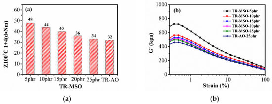 Figure 5a shows the Mooney viscosity of different amounts of TR-MSO-6% compound. When the amount of MSO-6 was increased from 5 to 25 phr, the Mooney viscosity of the resulting ubber compounds decreased continuously. The Mooney viscosity of AO-plasticized TR is slightly lower than that of TR-MSO at the same plasticizer content of 25 phr. The rubber processing analysis (RPA) method was also used to study the processing properties, and the RPA curves are shown in Figure 5b. We can see that with increasing amount of MSO-6S, the initial G’ and the difference between initial G’ and final G’ (ΔG’) became smaller, indicating a low Payne effect and better processing properties for obtaining a better filler dispersion. This phenomenon could be explained by the fact that, with increasing MSO content, the forces between the nanofillers and the rubber molecules are further reduced by the lubrication action. In accordance with the Mooney viscosity result, G’ of TR-MSO-25phr is slightly higher than that of TR-AO. These differences between TR-MSO-25 and TR-AO are not obvious, and could be ignored in the tire industry.