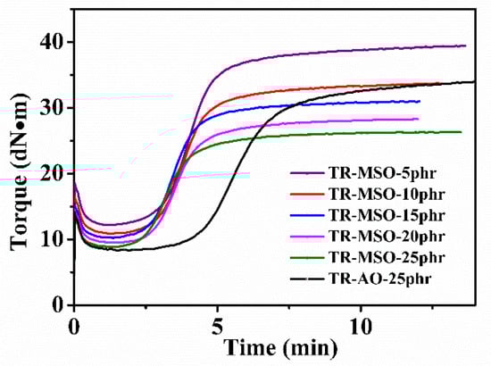 The torque difference of TR-MSO is lower compared with that of TR-AO because MSO could also influence the crosslinking density. However, all the MSO-plasticized rubber has much shorter T90 than TR-AO, which could enhance the production efficiency and reduce the energy consumption during the rubber molding process.