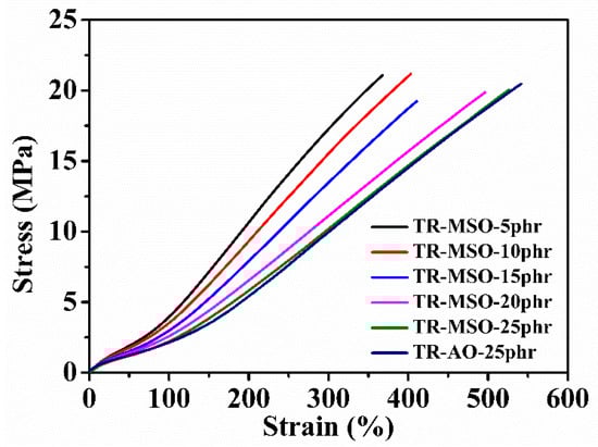The stress-strain curves of TR-MSO and TR-AO are shown in Figure 7 and the mechanical properties of TR-MSO and TR-AO are shown in Table 5. With increasing amount of MSO-6%, the hardness and modulus were reduced while the elongation at break increased due to the enhanced plasticization effect. Note that the tensile strength of TR-MSO is similar compared with TR-AO, means that the crosslinking densities of these rubbers are adequate. That is to say, after being modified with sulfur, MSO would not harm the crosslinking density. With the same content, the tensile strength, modulus, and hardness of TR-MSO-25phr and TR-AO are almost the same. Note that the aging coefficient (100 °C for 48 h) of TR-MSO-25phr is higher and the Akron abrasion loss is much smaller, compared with those of TR-AO. The small Akron abrasion loss means excellent wear resistance and longer life of the tire, which is very important for tires. In a word, the mechanical properties of MSO-6%-plasticized tire tread rubber are better than or at least comparable with those of AO-plasticized rubber.