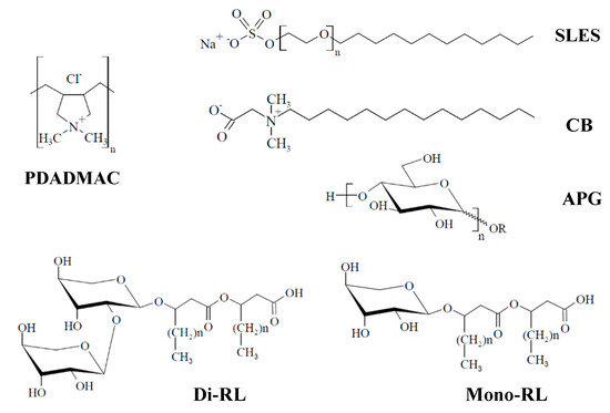 The procedure described above was used for describing the behavior of mixtures formed by PDADMAC containing 100 monomers, and different surfactants: (i) three anionic, namely sodium laureth sulfate (SLES), di-rhamnolipid (di-RL), and mono-rhamnolipid (mono-RL), (ii) the zwitterionic cocobetaine (CB), and (iii) the neutral alkyl polyglucoside (APG), under conditions in which the ionic strength was fixed by the addition of KCl and the pH at 5.6. This work paid interest to the study of the polyelectrolyte-surfactant mixtures where the ionic strength was fixed using KCl. However, it should be expected that the nature of the counterions may present a decisive impact in the interactions between the polymer and the surfactant molecules [62]. This may lead to changes in the complexation process, which allow one to tune the nature of the aggregates formed upon mixing the polyelectrolyte and the surfactant, as was stated by different works [15,18,19,20,21,24,25,30]. Figure 1 summarizes the chemical structures of the polyelectrolyte and the studied surfactants.