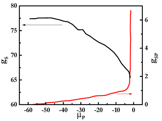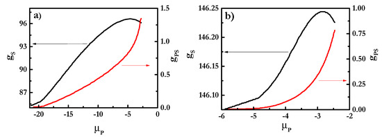 Figure 3 shows the binding isotherms for mixtures of PDADMAC with SLES (Figure 3a) and CB (Figure 3b). These isotherms considered the formation of polyelectrolyte-surfactant complexes where spherical micelles of the surfactant formed a core surrounded by the polyelectrolyte chains, as is sketched in Figure 2a. It is worth mentioning that other geometries for the micelles, which also lead to stable complexes (cylindrical for all the mixtures and lamellar structures when mixtures including rhamnolipids are concerned), were considered. However, for the sake of simplicity, this work is focused on mixtures where the surfactant concentration is not high enough to distort the spherical geometry of the micelles and the discussion will be focused on this particular geometry. On the basis of the binding isotherms, it is possible to evaluate the assembly process of polyelectrolyte-surfactant complexes in terms of the evolution of the aggregation number of the surfactant in the complexes, gS, and the degree of polyelectrolyte-surfactant binding, gPS, i.e., the ratio between the number of monomers and surfactant charges, with the increase in the chemical potential of the polymer, μP, i.e., the polymer concentration [56].
