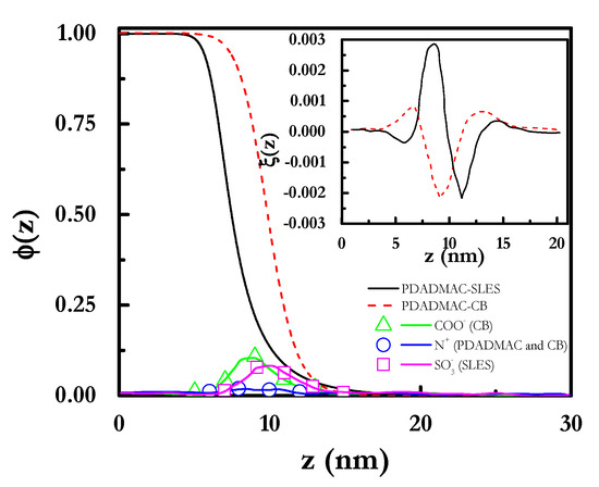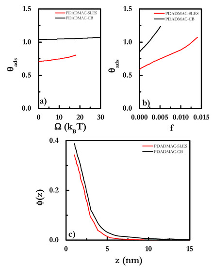 The dependences in the coverage on the grand potential Ω and the f-ratio (the ratio between the number of monomers and the number of surfactant molecules) confirmed the trend found for the total adsorbed amount, as was observed using ellipsometry in our previous study [66], i.e., the adsorbed amount with the surfactant concentrations. However, SCF calculations predicted higher adsorptions for PDADMAC-CB mixtures than for PDADMAC-SLES ones, which differs from the experimental findings. This may result from the fact that the calculated adsorption isotherms were based on the equilibration of polyelectrolyte-surfactant aggregates where surfactant micelles were decorated by surfactant, and hence the deposition occurred through the deposition of such structures directly onto the surface. This led to a situation where the electrostatic interactions between the surface and the polymer at the outermost region of the micelles was the driving force for the deposition, with this deposition mechanism resulting in a higher deposition as the size of the complexes increased. Similar conclusions may be extracted from the volume fraction profiles shown in Figure 11c, where it is clear that layers containing CB were extended to larger distances from the surface than those formed by PDADMAC-SLES mixtures.