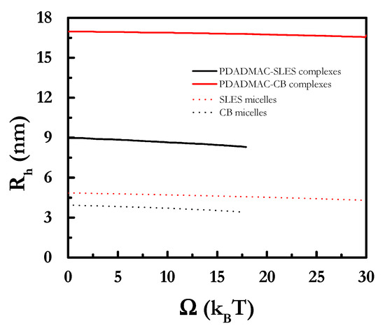 Figure 5. Grand potential Ω dependences of the hydrodynamic radius, Rh, for the polymer–surfactant complexes and the surfactant micelles in absence of polyelectrolyte.