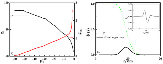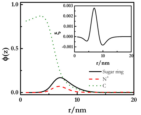 The lack of electrostatic interactions is clearly evidenced from the absence of electroneutralization in the complexes, i.e., gPS did not reach the value of 1, even though there was a continuous increase in the binding with the chemical potential of the polymer. A deeper understanding of this may be obtained from the analysis of the radial volume fraction profile shown in Figure 7. This shows that the polyelectrolyte always remained at the outer shell of the spherical micelles, even though the mostly positive values found for the dimensionless charge density profiles (inset in Figure 7) are a clear confirmation of the absence of real charge compensation, as is expected from the neutral character of APG, in agreement with previous experimental results [38]. Thus, the presence of some uncompensated charges makes the formation of stable complexes possible over a longer composition range than those involving a charged surfactant such as SLES, yielding a behavior similar to PDADMAC-CB mixtures. Even though the stability of complexes is almost guaranteed in a wider range of compositions, the increase in polymer in the complexes can lead to a worsening of the stability, as a result of the depletion of the surfactant from the micelles, or by a bridging phenomenon through the formation of hydrogen-bonds between the head groups of APG.