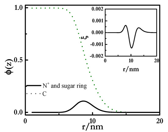 The use of SCF calculations relied on the discretization of the molecules, following the scheme proposed by Scheutjens and Fleer [43,46,48]. This was done in terms of, lattice size, i.e., the size of the atoms which composed the molecules, which was fixed at a = 0.3 nm [56,57]. The central idea of SCF calculations is to replace the interactions occurring within an ensemble of molecules by the interaction of an effective molecule within a field, thus approximating a many-body problem as a one-body problem. The mean-field free-energy functional can be written in terms of the molecule’s segment density profiles for a specific segment type, φX(z), and the conjugate segment potential profiles, uX(z), with X referring to a segment type and z indicating the spatial coordinate. The model introduced the water hydrogen-bonding capability, mainly with oxygen and hydroxyl groups of sugar rings, using a five-site description of water molecules, and negative Flory–Huggins parameters that ensured the solubility of the considered species. For the sulfonate groups, a five-sites representation was also used, as well as for cationic groups of PDADMAC and zwitterionic surfactant, i.e., N. The inclusion of a detailed molecular structure, and especially those aspects related to the hydrogen bonding of the complexes, played an important role for a proper description of the phase behavior of polyelectrolyte-surfactant complexes, as was recently stated by Ali et al. [58]. The optimization process was based on a numerical SCF procedure which allowed us to relate the volume fractions and the potentials following the basic principles described in the literature [43,51,56,57]. It is worth mentioning that the volume fraction presents a key role in the development of the SCF calculation because it allows one to derive other parameters, including the electrostatic potential, the charge distribution, and the local dielectric permittivities [51].