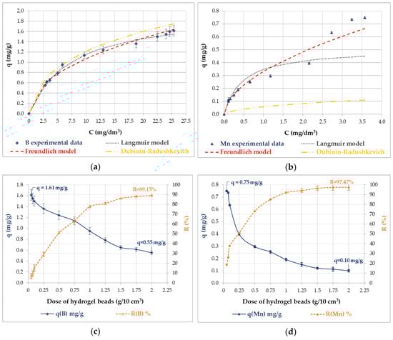 Boron and manganese adsorption isotherms and the effect of the amount of sorbent on boron and manganese adsorption are shown in Figure 1. The maximum adsorptive capacity of boron, q, was equal to 1.61 ± 0.1 at 25 °C, for a contact time of 24 h, and an initial boron concentration of 26.4 mg/dm3, while the adsorptive capacity of manganese was equal to 0.75 ± 0.01 at 25°C, for a contact time of 24 h, and an initial manganese concentration of 4.4 mg/dm3. Furthermore, a high removal efficiency was achieved, 89.2 and 97.5% for boron and manganese, respectively. In the equilibrium state, the content of boron and manganese in the hybrid chitosan-zirconium hydrogel beads (after dissolving three samples of thermally dried sorbent in concentrated HNO3) was equal to 1.645 ± 0.061 and 0.770 ± 0.005 mg/g, respectively, which agreed with the experimental adsorptive capacity calculated according to Equation (2).