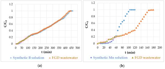 The column performance in the removal of boron and manganese from synthetic solutions and real wastewater was analyzed using breakthrough curves. Figure 2 shows the boron and manganese breakthrough curves collected in both the synthetic solution and wastewater. The breakthrough curves of manganese assumed a characteristic S shape, while the breakthrough curves of boron indicated a slow process of saturating of the bed.