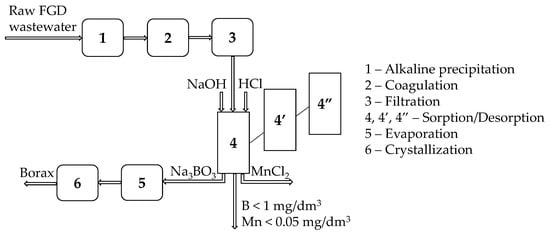 The main source of energy in Poland is coal combusted in power plants. This leads to the generation of inconvenient by-products, namely flue gases []. One of the most commonly used flue gas desulfurization (FGD) technologies for scrubbing pollutants from power plant gas emissions is a wet scrubber system. In this process, many pollutants, including coal and limestone, end up in the circulating water that is partly discharged from the scrubber system. The stream contains contaminants from coal and limestone and is acidic and supersaturated with gypsum, with high concentrations of TDS (total dissolved solids), TSS (total suspended solids), heavy metals, chlorides, and occasionally, dissolved organic compounds [,]. Suspended solids are removed in the course of the alkaline precipitation and coagulation processes, followed by settling of the solids. FGD wastewater often requires additional treatment for the further elimination of boron and heavy metals [].