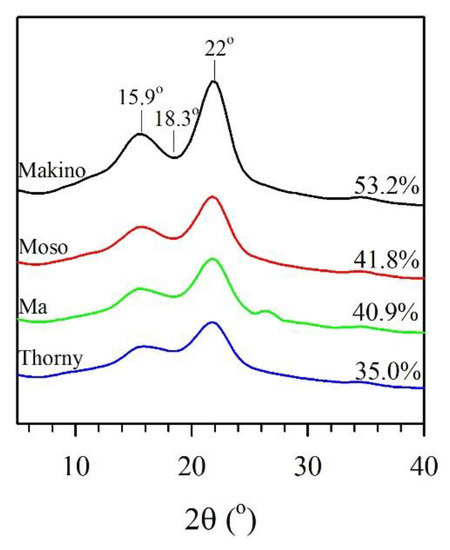 The chemical compositions of various BFs are listed in Table 2. The extractive contents of the Makino, Moso, Ma, and Thorny BFs were 2.9, 3.8, 8.5, and 6.9%, respectively, which yields an order of Makino < Moso < Thorny < Ma. It is noted that their holocellulose contents were in the order of Makino > Ma > Moso > Thorny (the values were 62.5, 58.0, 57.1, and 56.0%, respectively). This result indicated that the Makino BF had the highest holoceullose content among all of the samples. Additionally, it is worth noting that the Moso BF revealed the lowest lignin content (24.5%), while there were no signifcant differences among the lignin contents of Makino, Ma, and Thorny BFs, which were in the range of 28.1% to 30.7%. As shown in Figure 1, the crystallinity indexes (CrIs) of various BFs were calculated by the XRD patterns. The major peaks of cellulose crystal diffraction were observed for all the samples at approximately 15.9° (101/10 lattice planes) and 22° (200 lattice plane), whereas the diffraction value at 18.3° represented the amorphous region [8]. According to Equation (1) described above, the CrI values were 53.2%, 41.8%, 40.9%, and 35.0% for Makino, Moso, Ma, and Thorny BFs, respectively. A parameter termed the CrI has been used to describe the relative amount of crystalline material in cellulose. Therefore, this result illustrated that the Makino BF had the highest ordered cellulose content among all the samples, while the lowest amount of ordered cellulose appeared for the Thorny BF.