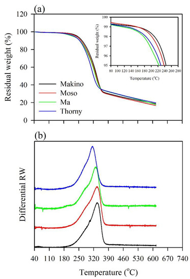 In this study, TG analysis was used at various thermal decomposition temperatures to interpret the preliminary evaluation of the thermal stabilities of the BFs and their BPCs during composite processing. Figure 2 shows the residual weight (RW) and differential RW curves of the different BFs from the results of the TG analysis. Órfão et al. [26] and Yang et al. [39] revealed that the thermal decomposition of wood is separated into three stages in the differential RW curve. The first stage corresponds to water evaporation, with a temperature range of 60–120 °C. The second stage simultaneously includes the total decomposition of hemicellulose and cellulose and the partial decomposition of lignin, at temperatures from 210–370 °C. During the third stage in the range of 370–480 °C, the remaining lignin decomposition and the combustion of the residues occur. As shown in detail in Figure 2a, the RW curves showed that various BFs started to exhibit significant weight loss at approximately 140–180 °C. Additionally, the temperatures at which the sample lost 3% (T3%) of its weight were 226, 219, 196, and 204 °C for the Makino, Moso, Ma, and Thorny BFs, respectively. The results demonstrated that the Ma BF exhibited the lowest T3% value among all the samples. This result is related to the Ma BF having the highest extractive content, as shown in Table 2. It is well-known that extractive decomposition occurs at lower temperatures since extractives are compounds with lower molecular weights than the other chemical components. Previous studies [40,41,42] indicated that extractives could promote the ignitability of wood at lower temperatures and accelerate wood degradation due to their higher volatility. Furthermore, the Makino BF had the highest T3% value (226 °C) and thus had higher thermal stability relative to the other BFs. This result is associated with the Makino BF having the lowest content of extractives. Figure 2b presents the differential RW curves of various BFs. These curves displayed a slight shoulder in the range of 250–300 °C, and remarkable peaks were observed in the range of 310–340 °C. According to the pyrolysis behaviors of the three main components (cellulose, hemicellulose, and lignin) in the differential RW curves, hemicellulose and cellulose were decomposed in active pyrolysis in the ranges of 220–315 °C and 315–400 °C, respectively [39]. The thermal decomposition of lignin occurs in active and passive pyrolysis over a wide temperature range from 160–900 °C without characteristic peaks [39]. As shown in Figure 2b, the hemicellulose decomposition in the Thorny BFs occurred at relatively low temperatures (215–285 °C), and the temperature of its characteristic peak (315 °C) was lower than those of the other BFs. This behavior may be related to the higher content of hemicellulose in Thorny BFs relative to those in the other BFs. Hence, this result indicates that a higher content of hemicellulose causes cellulose decomposition at a lower temperature and accelerates the thermal degradation of a BF. John and Thomas [43] explained that hemicellulose comprises a random amorphous structure and is more easily degraded than the other components at its thermal decomposition temperatures (220–315 °C).