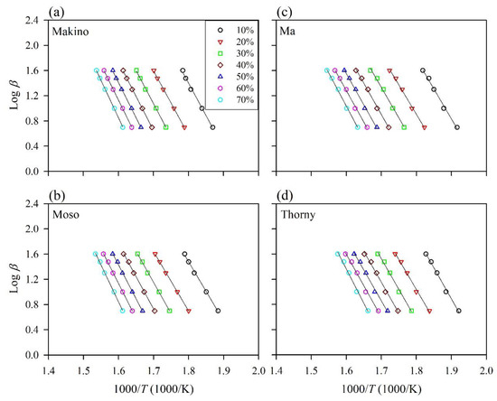 Typical isoconversional plots of various BFs using the Flynn–Wall–Ozawa (FWO) method. (a) Makino, (b) Moso, (c) Ma, and (d) Thorny.