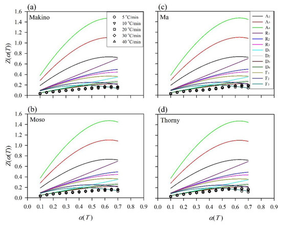 For various heating rates (β) and a given conversion rate (α), a linear relationship is observed by plotting log β versus 1/T, and the Ea value is calculated from the slope of the straight line [31,32,33,34,35]. The reaction mechanism of the decomposition process is determined by the Criado method [28,36], which assumes that the Zm(α) master curves are a convolution of the functions f(α) and g(α) corresponding to the different models listed in Table 1 [37,38]: