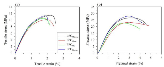 Stress-strain curves obtained from the tensile (a) and flexural (b) tests for various BPCs.