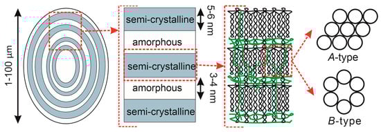 Starch consists of two types of polysaccharides. Amylose is a linear polymer, while amylopectin is a branched one. Figure 1 shows the starch structure, from granules to glucosyl units. The size of a schematic granule with growth rings extending from the hilum ranges from 1 to 100 μm [3]. The supramolecular complex of these polysaccharides forms granules that are partially crystalline [12,13]. A granule contains alternating semicrystalline and amorphous regions. The crystalline region consists of double helices of amylopectin, while the amorphous region is formed by amylose chains and branched segments of amylopectin. Amylose chains are interspersed among with amylopectin chains. The morphology, shape, size, degree of crystallinity and reactivity of starch depend on the origin and composition of the starch-bearing feedstock.