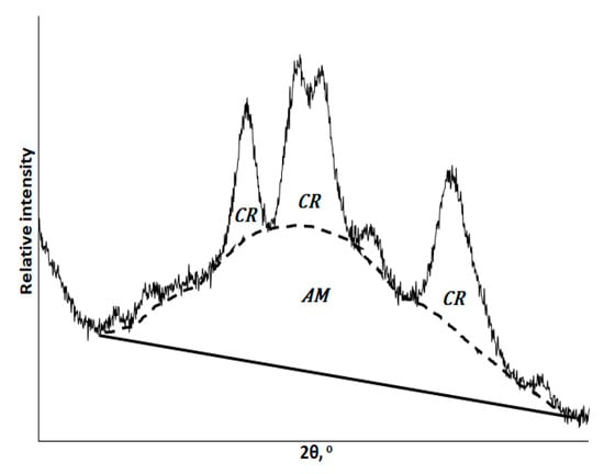 The degree of crystallinity of starches under study was estimated using the method proposed by Nara and Komiya (1983) [12,15]. A smoothed curve connecting peak baselines was plotted on the XRD pattern. The areas above and under the smoothed curve corresponded to the crystalline and the amorphous portions of starch, respectively. The crystallinity degree was calculated as a ratio between the area corresponding to crystallites and the total area of the XRD pattern under the curve (Figure 2).