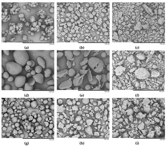 Scanning electron microscopy (SEM) images of the investigated starches with different crystalline structures were recorded (Figure 3).