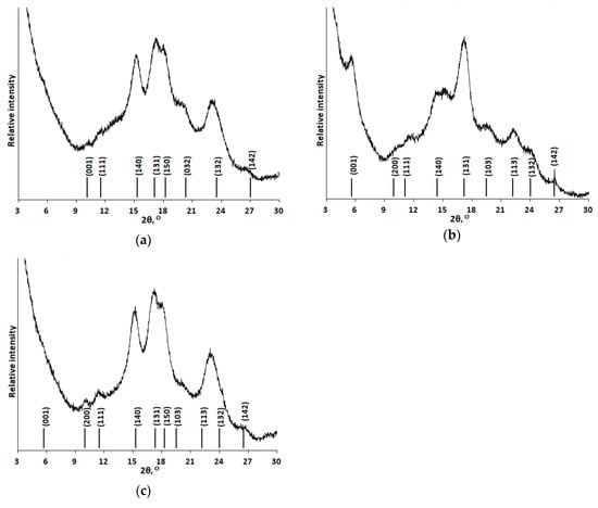 The structural properties of starches were characterized by X-ray diffraction analysis on a D8 Advance powder diffractometer (Bruker, Karlsruhe, Germany) with monochromatic CuKα radiation in the Bregg–Brentano reflection geometry. Step size was 0.0195°. The analysis was conducted in a range of 2θ angles (3–70°) at a voltage of 40 kV and current of 40 mA. X-ray radiation wavelength was 1.5406 Å. No diffraction peaks were recorded at 2θ angles > 30°, which is consistent with the data published earlier [2,14,15,16,17]. In this connection, the range of 2θ angles of 3–30° was used for the sake of clarity.