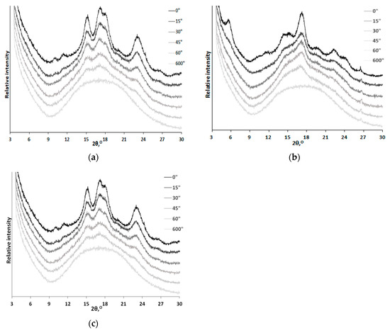 The X-ray diffraction patterns of corn, potato, and tapioca starches are shown in Figure 4. The XRD pattern of corn starch contains diffraction peaks (2θ) at 15.00°, 22.93°, and a doublet at 17.02° and 17.92°, which correspond to the A-type crystalline structure (Figure 4a) [14,34]. The XRD pattern of potato starch contains diffraction peaks (2θ) at 5.58°, 15.13°, 17.23°, 19.67°, 22.20°, 24.00°, and 26.35°, which correspond to the B-type crystalline structure (Figure 4b) [14,34]. The C-type crystalline structure consists of A- and B-type crystallites, so the XRD pattern can contain various superpositions of the characteristic diffraction peaks depending on the ratio between the contents of these polymorphs. Diffraction peaks (2θ) at 15.15°, 22.78°, and a doublet at 17.12° and 18.19 corresponding to the C-type crystalline structure are observed in the XRD pattern of tapioca starch (Figure 4c) [14,34].