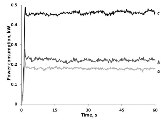 Actual power consumption of the planetary ball mill AGO-2: (a) the planetary gear without jars, (b) the planetary gear with empty jars; and (c) jars containing grinding bodies and starch.