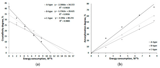 The diagrams illustrating changes in the crystallinity degree and normalized changes in the amorphization degree (which are visually more informative) are shown in Figure 8. One can determine that complete amorphization of corn, potato, and tapioca starches will require 16.5, 14.9, and 11.2 W*h, respectively.