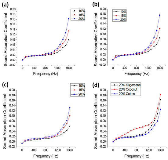 (a) Effect of fiber content on the sound absorption coefficient (SAC) of the sugarcane fiber-based composites. (b) Effect of fiber content on SAC of the coconut fiber-based composites. (c) Effect of fiber content on SAC of the cotton fiber-based composites. (d) Effect of fiber type on acoustic properties of composites with 20% fiber content.