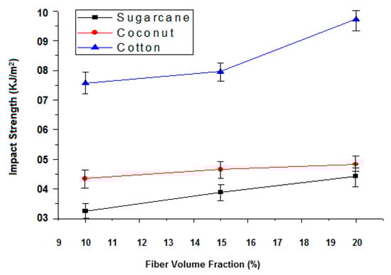 Results revealed that when increasing fiber content, impact strength also increases (Figure 5). It has been observed that 10%, 15% and 20% of the sugarcane fiber content shows an impact strength of 3.25 kJ/m2, 3.89 kJ/m2 and 4.43 kJ/m2, respectively. Overall, a 36% increase in impact strength is observed with the increase of fiber content from 10% to 20%. Similarly, an 11% increase in impact strength is observed, when the coconut fiber content is increased from 10% to 20%. In the case of the cotton fiber-reinforced composites, there is a 28% increase in impact strength when the fiber content increases from 10% to 20%. In a fiber-reinforced composite system, the reinforcement is the main constituent which is responsible to bear the impact load. Similar observations have been made by several other researchers [33,34].