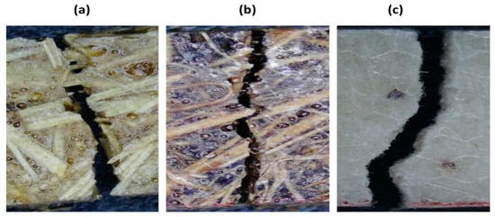 Microscopic images of impact broken samples: (a) sugarcane (b) coconut (c) cotton fiber-reinforced composites.