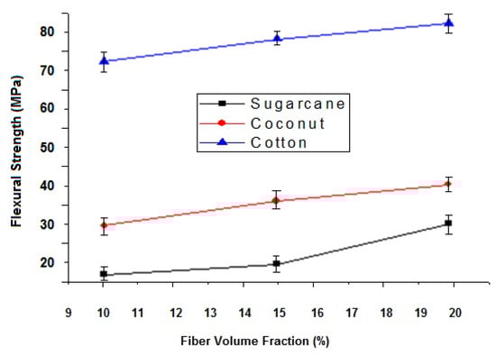 It has been observed that when increasing fiber content, flexural strength also increases. The flexural rigidity has a direct proportionality with the modulus of elasticity or tenacity. The fiber reinforcement is the major load-bearing element in a composite system. By increasing the fiber volume fraction (FVF) from 10% to 20%, there is a substantial increase in flexural strength. FVF can be further increased by impregnation using the infusion method. As the set up used in the current investigation was a relatively simpler one, there was a restriction to maximum FVF and preparing void-free samples. Previously, researchers have found a significant increase in flexural strength by increasing fiber content in composites [37,38].