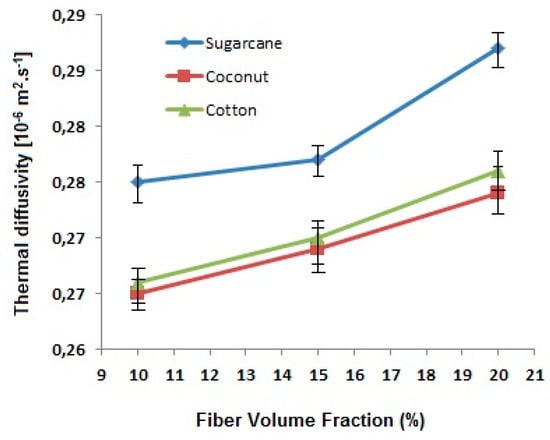 It is found that the composites improve diffusivity due to the fibrous reinforcement. A higher volume fraction of fibers leads to an increase in thermal diffusivity. Among the fiber types investigated, the sugarcane-based composite panels diffuse heat more significantly in comparison with coconut and cotton-based composites. This may be attributed to the chemical composition of sugarcane which is rich in hemicellulose and lignin.