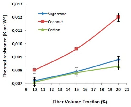 Effect of fiber type and fiber content on thermal resistance of the sugarcane, coconut and cotton fiber-reinforced composites.