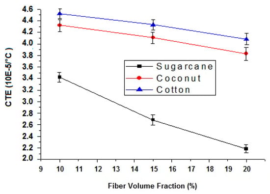 It has been observed that, in all cases, increasing the fiber content decreases the coefficient of thermal expansion as shown in Table 9 and Figure 10. It is due to the fact that the thermal expansion of epoxy (matrix) is much higher than fibers (reinforcement) therefore by increasing fiber content (FVF), results in decreasing in CTE [40,41]. By lowering the coefficient of thermal expansion, the composite materials will deform to a relatively smaller extent in high-temperature applications.