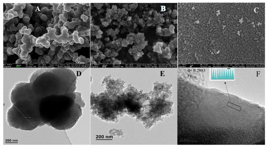 Scanning electron microscopy (SEM) images of polypyrrole (PPy) (A) and polypyrrole-m-phenylediamine/Fe3O4 (PPy–mPD/Fe3O4) nanocomposite (B,C); Transmission electron microscopy (TEM) images of PPy (D) and PPy–mPD/Fe3O4 nanocomposite (E); High resolution transmission electron microscopy (HR-TEM) of the PPy–mPD/Fe3O4 nanocomposite (F). N.B: Field-emission scanning electron microscopy (FE-SEM) image of the nanocomposite carried out in the backscattered mode (C).