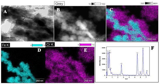 (A) HR-TEM images, (B–E) elemental mapping images, and electron diffraction X-ray scattering (EDX) spectra (F) of the PPy–mPD/Fe3O4 nanocomposite after Cr(VI) adsorption.