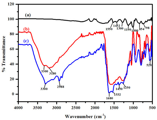 Fourier transform infrared (FTIR) spectra of PPy and PPy–mPD/Fe3O4 nanocomposite, before and after Cr(VI) adsorption, are provided in Figure 3. Figure 3a shows the bands obtained for the PPy homopolymer at 798, 854, 1000, 1190, 1300, 1452 and 1511 cm−1, corresponding to the C–H out-of-plane ring deformation of pyrrole, C–H in-plane deformation, N–H in-plane deformation, C–N stretching, C–N ring stretching, as well as the ring stretching mode of C=C [21]. The presence of Fe3O4 nanoparticles in the PPy–mPD/Fe3O4 nanocomposite before the adsorption of Cr(VI) is confirmed by the intense band at 520 cm−1 as shown in Figure 2b. The band at 3180 cm−1 is attributed to the N–H stretching vibration of the mPD in the nanocomposite. In addition, the vibration band at 3300 cm−1 is associated with the presence of moisture in the nanocomposite [22].