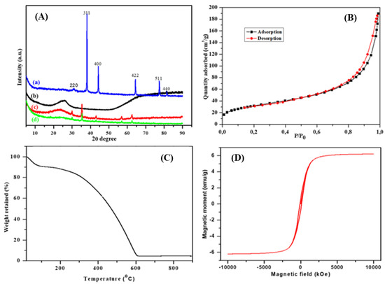 XRD, BET, TGA and VSM analyses were conducted to support the FTIR findings for the successful synthesis of the nanocomposite, and the results are presented in Figure 4. The XRD analysis was done, and the diffraction patterns of the synthesised PPy, magnetite nanoparticles and the PPy–mPD/Fe3O4 nanocomposite prior to and after Cr(VI) adsorption, are given in Figure 4A(a–d). The XRD pattern of the Fe3O4 nanoparticles (Figure 4A(a)) exhibits sharp peaks appearing at 2θ = 32.2, 38.0, 44.4, 64.7, 78.1 and 83.5°, assigned to the (220), (311), (400), (422), (511) and (440) planes, respectively, indicating the highly crystalline phase purity of the nanoparticles [20]. These results agree well with the HR-TEM results in Figure 1f. Figure 4A(b) shows the XRD pattern of the PPy with a broad peak appearing at 2θ = 25°, suggesting an amorphous structure of the PPy homopolymer [2]. It was seen that upon the nanocomposite formation (Figure 4A(c)), the patterns shifted to lower 2θ values as compared to PPy homopolymer and Fe3O4 nanoparticles with the disappearance of peak intensity of the 511 and 440 planes. Furthermore, Figure 4A(d) is the XRD pattern of the PPy-mPD/Fe3O4 nanocomposite after Cr(VI) adsorption, which shows the reduction in peak intensity at 2θ = 25°, indicating the presence of adsorbed Cr(VI) on the surface of the PPy-mPD/Fe3O4 nanocomposite [3,6].