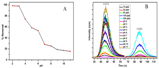 The effect of pH on Cr(VI) by adsorbent (A) and IC-ICP-MS chromatograms for analysis of chromium speciation (B) in standard solutions and the solutions obtained from the pH effect experiments.