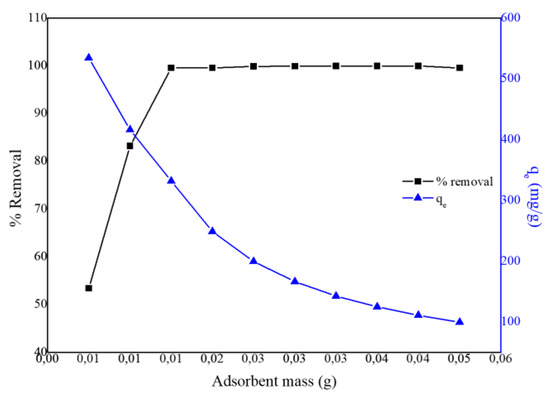 The effect of adsorbent dosage was performed to determine the minimum amount of PPy–mPD/Fe3O4 nanocomposite required to remove (% removal) and the adsorption equilibrium (qe) of the Cr(VI) from the solution at pH 2 (100 mg/L, 50 mL). The % removal and qe results are presented in Figure 6. By varying the adsorbent dosage (0.005–0.05 g), the minimum amount of nanocomposite required to remove Cr(VI) from aqueous solution entirely was found to be 0.025 g.