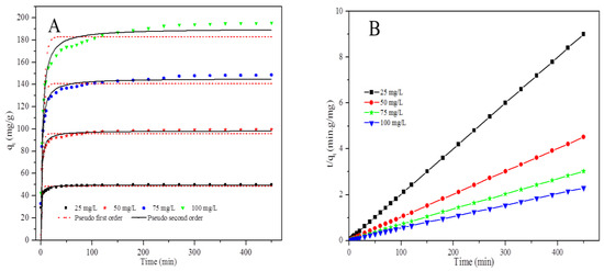 Nonlinear fitting of the data to the pseudo-first-order (PFO) and pseudo-second-order (PSO) kinetic models (A) and Fit of the data to the linear form of the PSO kinetic model (B) for Cr(VI) adsorption by the PPy–mPD/Fe3O4 nanocomposite.