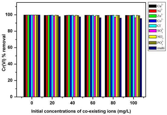 The effect of selected ions (Cl−, Co2+, Cu2+, Ni2+, Zn2+, NO3−, PO43− and SO42−) on the Cr(VI) removal by the PPy–mPD/Fe3O4 nanocomposite was studied by varying the coexisting ions concentrations in solutions from 20 to 100 mg/L, with the Cr(VI) concentration at x mg/L. Figure 9 revealed that the four cations (Cu2+, Co2+, Zn2+, Ni2+) had no significant effect on the removal of Cr(VI). This observation was anticipated, since the adsorption of Cr(VI) at pH 2 takes place via anion exchange with dopant Cl− ions in the polymer, and consequently, the PPy-mPD/Fe3O4 nanocomposite has no affinity for cations [25,39]. Considering that Cr(VI) exists as an oxyanion, the presence of other anionic compounds may affect its adsorption onto the PPy-mPD/Fe3O4 nanocomposite. Hence, the effects of anions (Cl−, NO3−, PO43− and SO42−) were examined to assess competition with Cr(VI) during adsorption. Figure 9 again showed that when the concentration of anions increases to 100 mg/L, there was a slight decrease of ≈3% in the removal of Cr(VI) by PPy-mPD/Fe3O4 nanocomposite, due the SO42− ions. Even though high concentration of SO42− existed, the removal of Cr(VI) by the PPy-mPD/Fe3O4 nanocomposite was still not hindered significantly. The insignificant effect of low affinity ligands Cl− and NO3− on Cr(VI) removal by the PPy-mPD/Fe3O4 nanocomposite may be because these ligands only form weak outer sphere complexes with binding sites on the adsorbents [26]. SO42− has the ability to form both inner and outer sphere complexes, but as a result of its high hydration energy, as compared to that of Cr(VI), and therefore does not affect the removal of Cr(VI) by the PPy-mPD/Fe3O4 nanocomposite [17,18]. The high selective behaviour of the PPy-mPD/Fe3O4 nanocomposite towards Cr(VI) may be attributed to the ability of PPy to reduce toxic Cr(VI) to less toxic Cr(III), because of a high positive redox potential of HCrO4− anions, the main form of Cr(VI) in solutions at low pH [3].