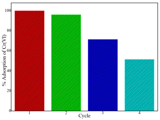 The regeneration and reusability of adsorbents are important aspects to consider for the economic sustainability of water purification processes. The potential to reuse the PPy-mPD/Fe3O4 nanocomposite was assessed by conducting four consecutive adsorption–desorption–regeneration cycles. For the desorption of Cr(VI) from the nanocomposite, an NH4OH solution of 0.1 M was used, followed by regeneration using 2 M HCl solution before being used for the next cycle. The results in Figure 10 showed that the PPy-mPD/Fe3O4 nanocomposite could be used for two consecutive cycles without a significant reduction in the adsorption capacity, as the removal efficiency was still above 90% in the second cycle. In the third and the fourth cycles, 70% and 50% Cr(VI) removal efficiency by the PPy-mPD/Fe3O4 nanocomposite was obtained, respectively. This may be attributed to an overoxidation of the PPy-mPD/Fe3O4 nanocomposite, which caused the deterioration of the polymer, and therefore reduced the adsorption sites available for Cr(VI) [26]. From these findings, it must be stated that this is only preliminary desorption research, and they should be continued to find a better desorption–regeneration procedure to prove the sorbent to be useful in practice.