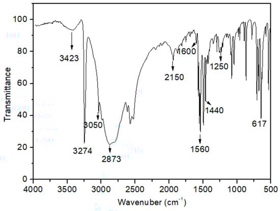 The molecular structure of SAA+ was characterized with FTIR, as shown in Figure 1. In the FTIR spectrum, the small and broad absorption peak located at 3423 cm−1 belongs to N-H of Ar-NH2, which meant the additive amount of m-amino arylacetylene was in excess than hydrogen chloride. The absorption peak at 3274 cm−1 is due to the C-H of methyl stretching vibration. The absorption peaks at 3050 cm−1 characterize the C-H stretching vibration in benzene ring structure. The wide absorption peak around 2873 cm−1 characterizes the N-H of -NH3+ stretching vibration. The absorption peak around 2150 cm−1 belongs to -C≡C-Si stretching vibration. The absorption peak 1560 cm−1 is due to the Ar-N stretching vibration and bending vibration. The absorption peaks at 1440 cm−1 and 1600 cm−1 correspond to C-C stretching vibration of benzene ring skeleton. The absorption peak at 1250 cm−1 is due to the symmetrical deformation vibration of Si-CH3. The absorption peak at 616 cm−1 is the stretching vibration of the Si-C bond. Based on the above FTIR absorption peaks analysis, the characteristic functional groups in the structure of the SAA could be determined, and the results showed that the molecular structure of the SAA accorded with the structure, as shown in Scheme 1.