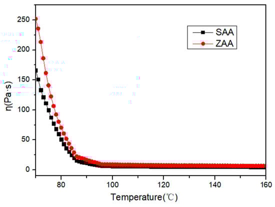 The viscosity-temperature relations of SAA and ZAA were measured at a heating rate of 5 °C/min. As shown in Figure 3, the viscosities of both resins decreased dramatically, with temperature increasing from 70 °C to 85 °C, and decreased gently, with temperature increasing from 85 °C to 95 °C, and finally became steady with temperature increasing from 95 °C to 160 °C. Compared with SAA, the ZAA had an extremely high viscosity above 250 Pa·s at 70 °C. Nevertheless, when the temperature was above 120 °C, the viscosity of ZAA was about 6.5 Pa·s, which was approximate to SAA (4.9 Pa·s). Therefore, the results showed that the ZAA resin had as wide processing window as SAA.