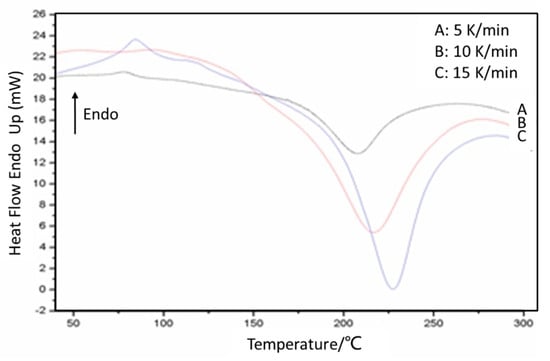 The differential scanning calorimetry (DSC) studies were conducted on the blends in hermetically sealed pans. The heating and cooling experiments were performed at 5, 10, 15, 20 °C/min, with Perkin Elmer DSC7, made in Waltham, MA, USA. The sample (10 mg) was sealed under nitrogen in aluminum pans. Temperature ramping DSC studies during curing were performed from 50 to 300 °C.