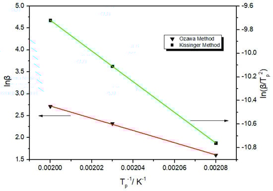 The Kissinger and the Ozawa methods were commonly used to deal with DSC curve data for all parameters of the curing reaction kinetics. According to the Kissinger method, it is assumed that the curing reaction rate maximizes at the peak temperature in DSC curve. Meanwhile, the Ozawa method assumes that the reaction conversion rate is a constant at the peak temperature. Further transformed, the Kissinger and the Ozawa Equation are illustrated in Equations (1) and (2), respectively.