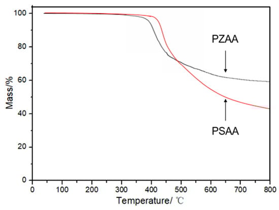 A thermogravimetric analysis (TGA) in air was conducted to provide the thermal property information of PSAA and PZAA resins. The TGA curves in air atmosphere are showed in Figure 7, and the characteristic parameters of the thermal decomposition are listed in Table 2. The two cured arylacetylene exhibited high thermal stability, of which Td5s and Ycs at 800 °C were above 400 °C and 40%, respectively. This indicated that polyarylacetylene possessed good thermal stability, because acetylene group could form a highly cross-linked and thermally stable network structure. The Td5 of PSAA is higher than PZAA by 22.5 °C, which indicated that the introduction of zirconium into PZAA decreased the thermal stability. This is because the star-shaped arylacetylene resin made it difficult for acetenyl to react with each other and there were decreases in the crosslinking density of PZAA. With temperature increasing further, the mass of cured resins changed sharply, and the polyarylacetylene decomposed violently. It is obvious that the mass of PSAA decreased sharply than PZAA and both resins shared one Yc of 72.3% at 485 °C. When the temperature was 700 °C, the decomposition of PZAA was basically over, but the decomposition of PSAA still processed. The Yc at 800 °C of PZAA and PSAA are 61.4% and 41.2%, respectively. Therefore, the introduction of zirconium into PZAA had little negative effect on Td5, but improved the Yc at 800 °C greatly.