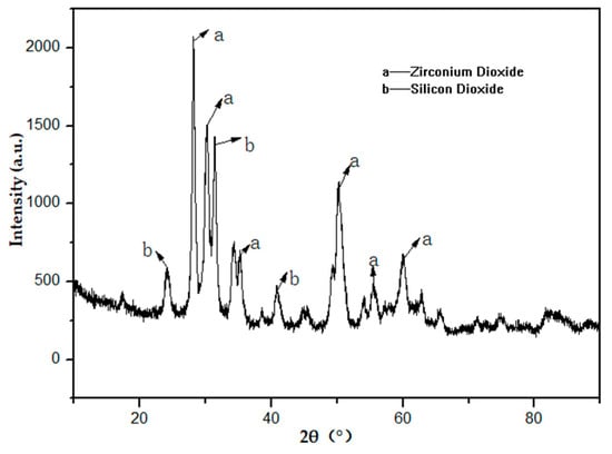 In order to further characterize the components of the PZAA residues after ablation, an XRD analysis was performed and the peak spectra is showed in Figure 8. As showed in the figure, the whole XRD diffraction peak spectrum showed that there was no glass phase in the sample, but only a crystalline phase structure. The existing crystal phase peaks could be divided into two main types. The strong diffraction peaks at 28.3°, 30.2°, 35.4°, 50.2°, 55.7° and 60.0° are due to zirconium dioxide (ZrO2), which could be referred to as the standard CARDS with codes 65-0461 (zirconia). Further analysis showed that the strong diffraction peak at 30.2° could correspond to a 111 crystal plane in ZrO2 structure. The diffraction peaks at 50.2° and 60.0° corresponded to the diffraction peaks on the 202 and 131 crystal face of ZrO2, indicating that PZAA mainly formed a ZrO2 crystal phase after sintering at 1000 °C. The strong diffraction peaks at 24.4°, 31.67° and 40.9° are the diffraction peaks of silicon dioxide (SiO2), and the reference code is 46-1045. The results showed that the PZAA contained a silica phase in the ablated residues, and formed a SiO2 crystal phase after ablation. The presence of ZrO2 and SiO2 indicated that the resin can form a ceramic structure after ablation in the oxygen-containing atmosphere, and the thermal insulation and high temperature resistance can protect the internal structure of the resin.