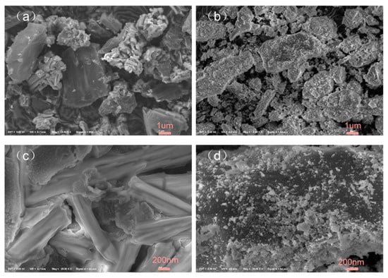 SEM spectrum of PZAA before ablation at 1000 °C (a,c); after ablation at 1000 °C (b,d).
