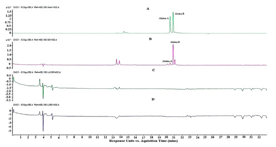 Figure 1A shows the chromatogram of the Aloin A and B (barbaloin and isobarbaloin) standard, which shows two peaks: the first equivalent to Aloin A with a Tr of 20.5 min and the second peak of Aloin B with 20.8 min. Tr of Aloin A and B (Figure 1B) present in the EA were 20.5 min and 20.8 min, respectively. In both chromatograms, standard and sample (1A and 1B), higher levels are presented for Aloin B, especially in the EA extract sample. This result corroborates those of the investigations of Logaranjan et al. [48,49], in the quantification of aloe by HPLC from the Aloe barbadensis extract.